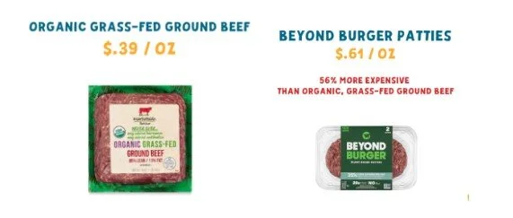 The Beyond Burger meat alternative is more expensive than the organic grass-fed ground beef and less nutritious. While it does provide a substantial amount of protein, the plant-based protein sources are less bioavailable than from real beef, and the micronutrients profile comes from fortified synthetic nutrients, which like protein, are not as bioavailable as eating the vitamin or mineral in its real food form.